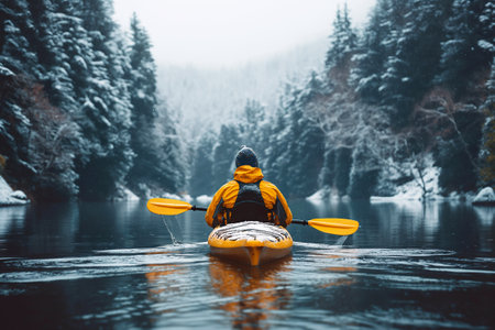 Kayaker paddling across a serene lake shrouded in mist, embracing the tranquility and breathtaking beauty of nature's landscape