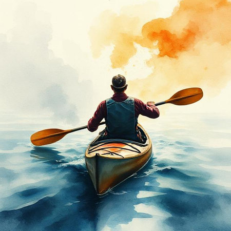 A man gracefully kayaks on the calm surface of the water. Generative AI