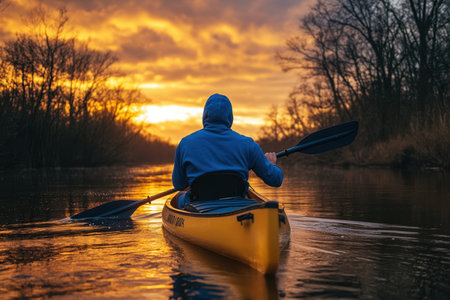 A lone kayaker navigates a tranquil river surrounded by lush forest, bathed in the warm glow of the setting sun.