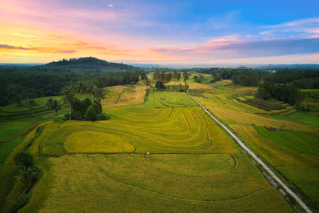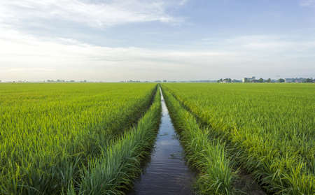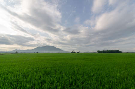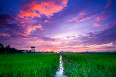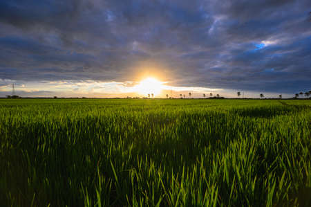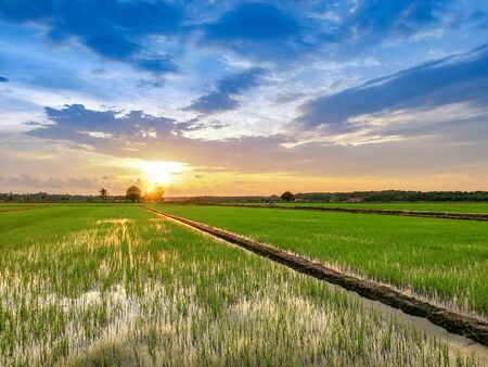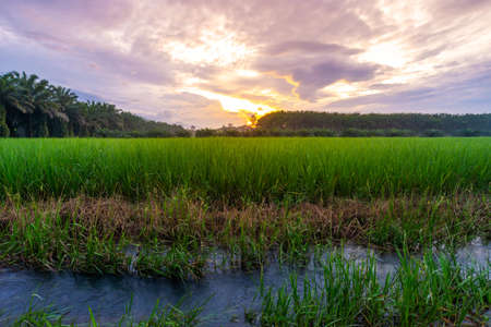 Beautiful view of rice paddy field during sunrise in Malaysia.