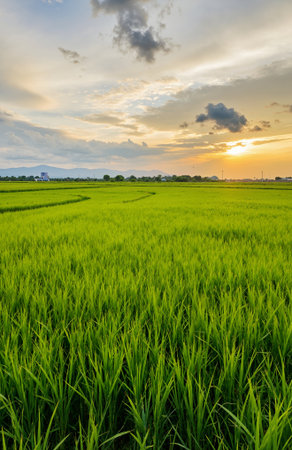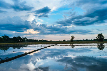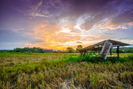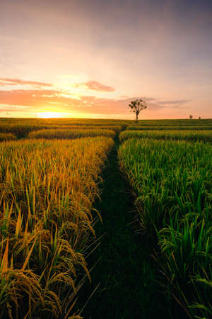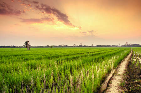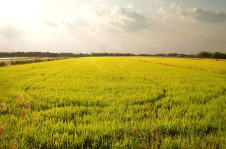 Rice field in the evening. Beautiful sunset with cloudy sky.