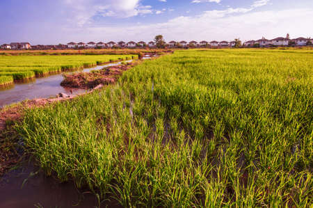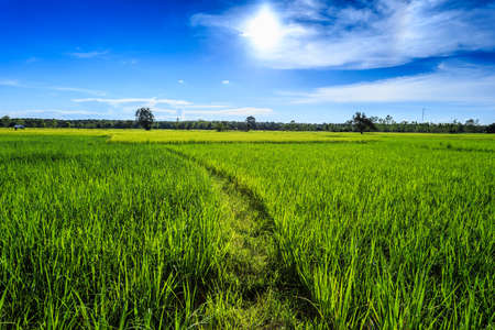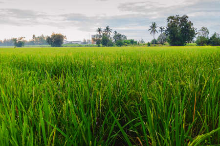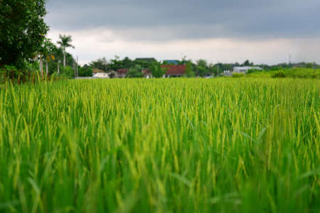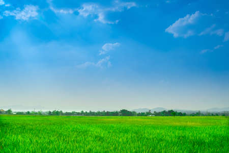 Rice paddy in rice field rural with cloud sky in daylight, Green field rural countryside, Paddy rice with green field
