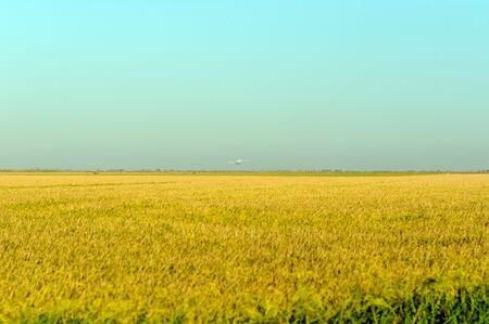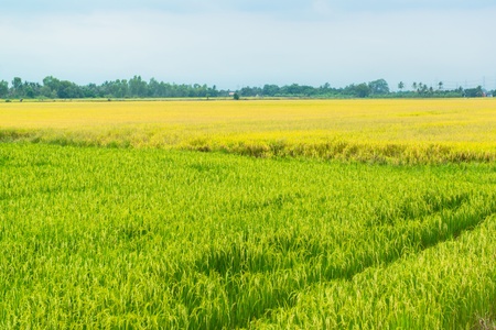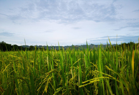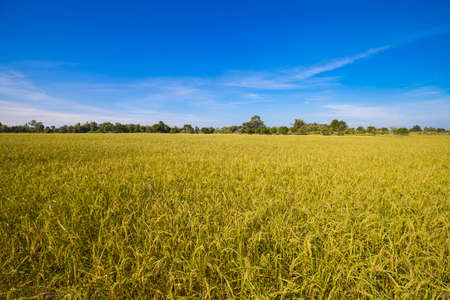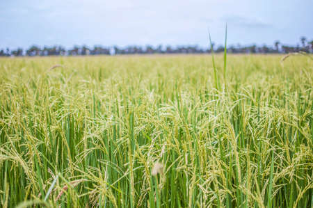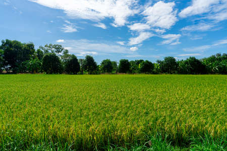 Close Up Yellow paddy fields in a rice field in a rural community in Thailand. The paddy fields are almost harvest time and there are beautiful skies all around.
