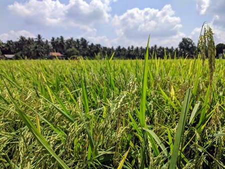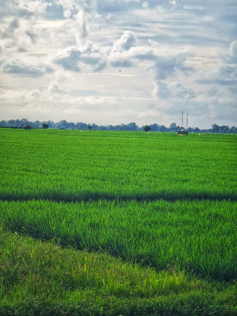 Lush green rice field stretches under a cloudy sky, providing a serene agricultural landscape perfect for nature and agricultural projects.