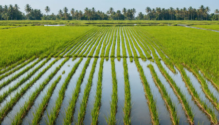 A wide shot of a flooded rice paddy field with rows of green rice plants, surrounded by palm trees in the background