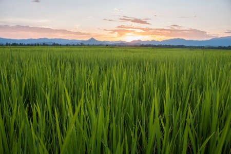 Panorama landscape of young green rice field and beautiful sky sunset in Thailand