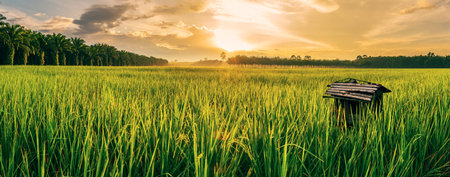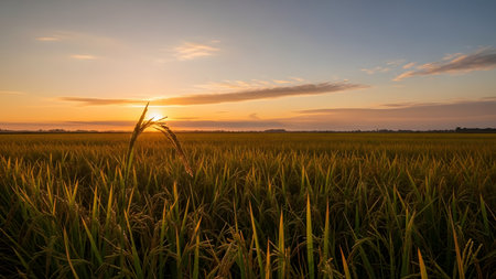 A vast rice paddy field glows under the warm golden light of sunrise with a focus on a single stalk of ripening grain in the foreground. The serene rural landscape represents agricultural abundance and the beauty of nature.