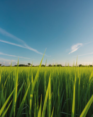 AI Generated. Serene landscape of lush green rice fields reflecting in tranquil river under blue sky