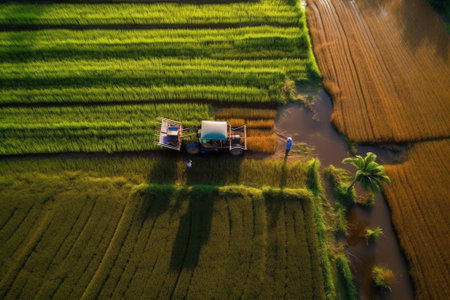 A stunning aerial view of lush green rice fields showcases the beauty of agriculture, complemented by a winding dirt path and vibrant skies.