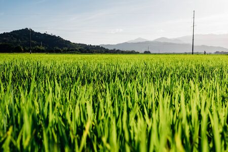 Green grass field cultivation in the Dominican Republic. Agriculture field plantation during produce aliment like rice. Natural meadow of rice made in sunset time. Horticulture in the evening.