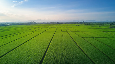 A drone shot capturing a lush green rice field with uniform rows stretching to the horizon, under a clear blue sky, showcasing the beauty of rural landscapes