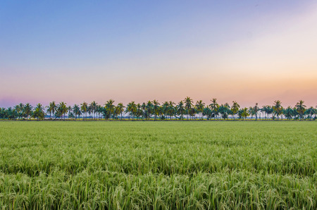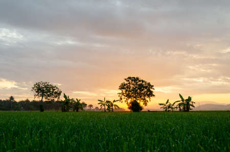 Beautiful view of rice paddy field during sunrise in Malaysia. Nature composition. soft focus,blur due to long exposure.visible noise due to high ISO