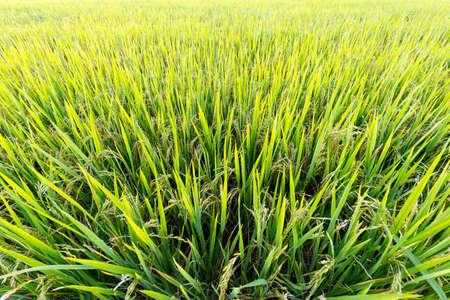 Close up of Asian paddy rice in green agricultural fields with plants waiting to be harvest in countryside or rural area in Asia. Nature landscape background.