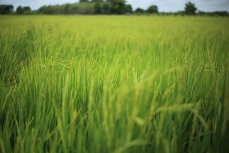Nature of rice field on rice paddy green color lush growing is a agriculture in asia