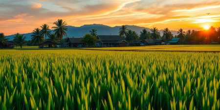 A peaceful sunset illuminates a lush rice field surrounded by palm trees and mountains, capturing the harmonious beauty of rural life in nature.