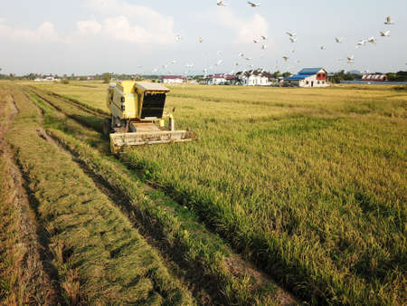 Georgetown, Penang/Malaysia - Feb 29 2020: Harvesting season in paddy field.
