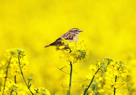 The whinchat (Saxicola rubetra) sits on a branch of rapeseed on a blurred background of a rapeseed field