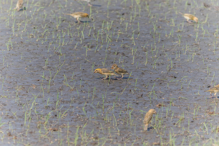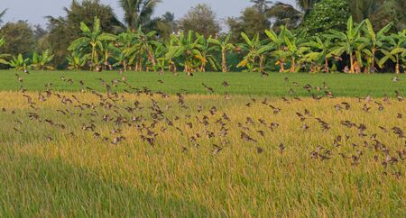 Birds stole rice in the paddy field.