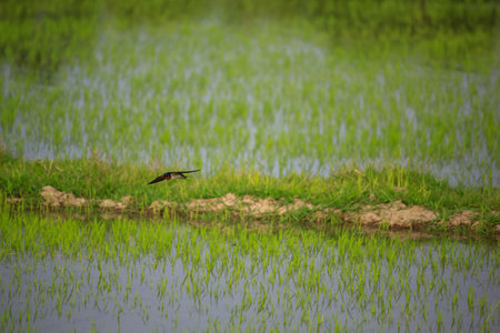 Swallow bird flying over the paddy field with reflection of tree