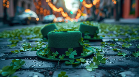 Green leprechaun hats decorated with shamrocks lying on cobblestones of a deserted city street for st patrick's day celebration