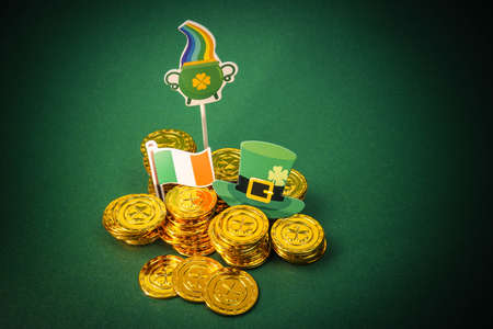 Leprechaun's Gold and the Irish Flag St. Patrick's Day, green holiday, quatrefoil, leprechaun with gold in a pot, Irish annual holiday, color green. Irish tradition celebration concept. High quality