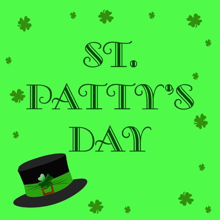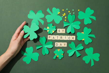 Happy St. Patricks Day decoration concept. Flat lay, top view of clover leaves on green background with the text.
