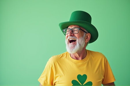 Elderly caucasian male celebrating in green hat and yellow shirt on green background.