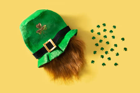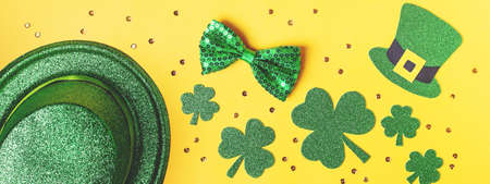 Saint Patrick's day holiday card with green shamrock symbols, hat, golden confetti. Traditional St. Patrick's Day green attire and decorations on yellow background. Web banner, copy space, top view