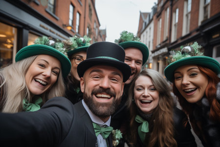 Joyful group of friends taking a selfie while celebrating St. Patrick's Day on a crowded street, Outdoors.