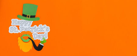 Saint Patrick's Day banner. Green hat of leprechaun, ginger beard and mustache, and smoking pipe, on orange background.