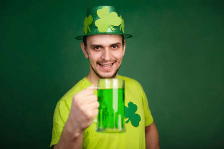 A man in a shamrock hat and green T-shirt drinks a large mug of green ale. Guy celebrates st patricks day with a glass of beer. Studio photo