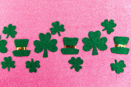 Happy St. Patrick's Day. Shamrocks and leprechaun hats pattern on pink glitter background.
