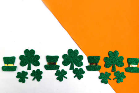 Happy St. Patrick's Day. Shamrocks and leprechaun hats pattern on white and orange background. Patrick Day symbols on Ireland flag background. Copy space for the text