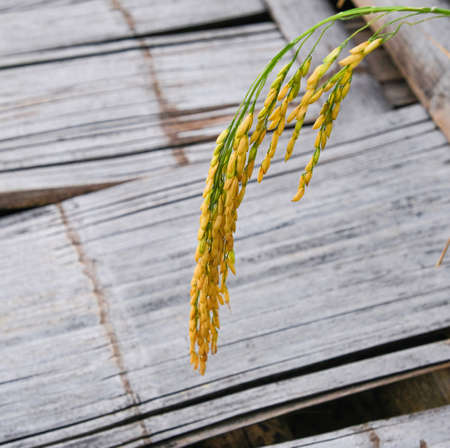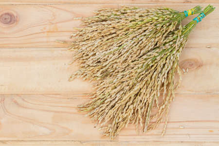 bouquet group yellow paddy before milling on isolated wooden bamboo background. golden rice on brown copy space.