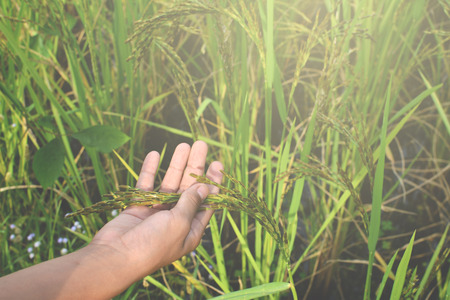 The farmer's hand touches the rice fields in warm sunlight. The concept of growing non-toxic plants.