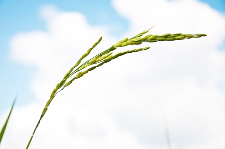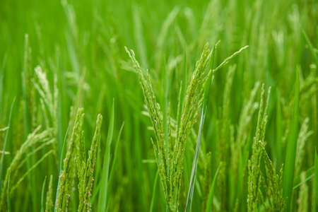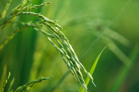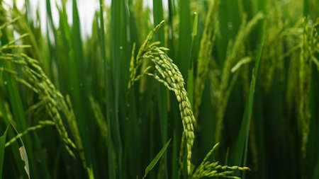 Spike green paddy rice in the field plant, Jasmine rice on blurred of nature background