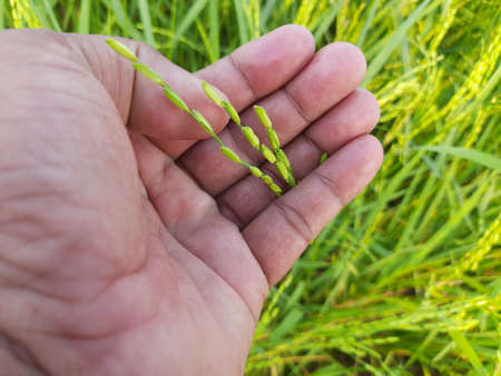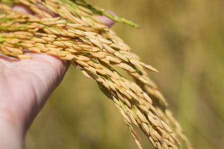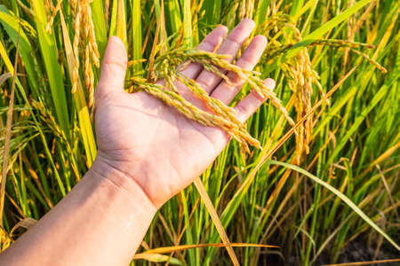 Hand owner of farmer holding cheking qualitya golden rice paddy in the rice field.