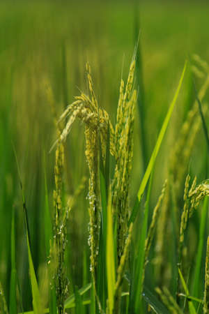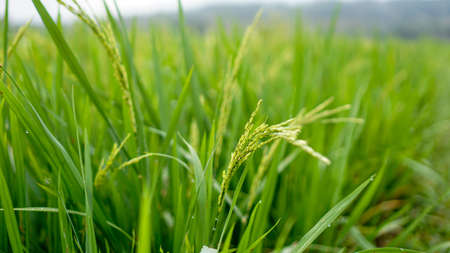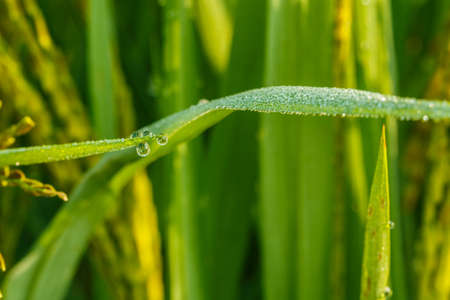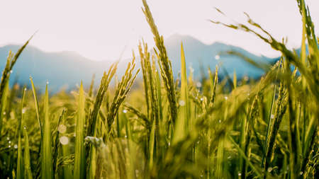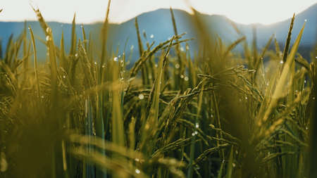 In the morning, rice plant in the rice field with dew by nature. Selective Focus. Suitable for use as wallpapers.