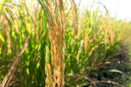 Ear of rice. Close-up to thai rice seeds in ear of paddy. Beautiful golden rice field and ear of rice.