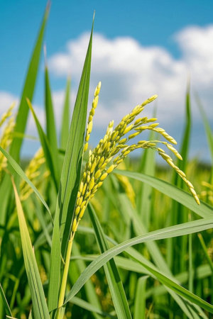In the background of the lush green field, rice plants sway gently as nature prepares for harvest on the peaceful farm, where every blade tells a story of growth.