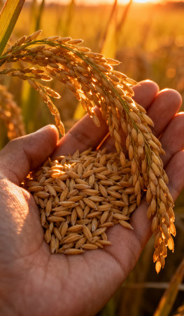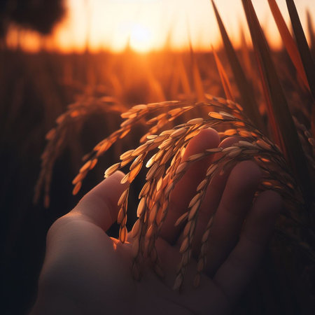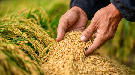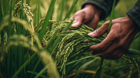 Close-up view of hands gently harvesting golden rice grains in a lush field, showcasing the careful work involved in agriculture and food production.