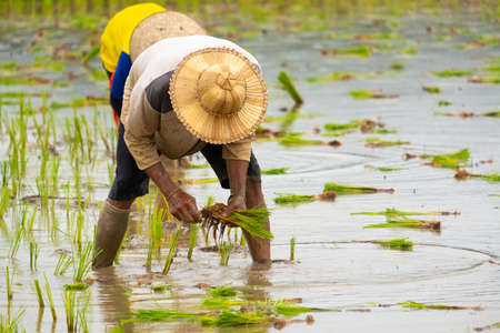 Farmers are planting rice in the farm.Farmers bend to grow rice.Agriculture in asia.Cultivation using people