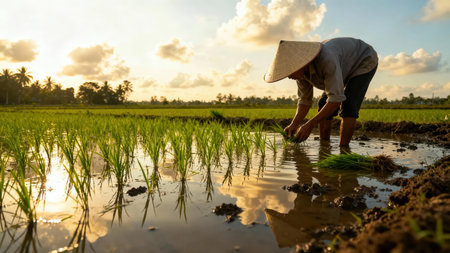 Tropical agricultural scene showing a farmer manually transplanting young green rice shoots into a flooded paddy field, illuminated by warm golden hour sunlight reflecting strongly off the shallow...