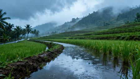Low angle view of lush green rice plants and water channels reflecting raindrop ripples, framed by a dirt path leading toward a row of coconut palm trees and misty rainforest mountains.