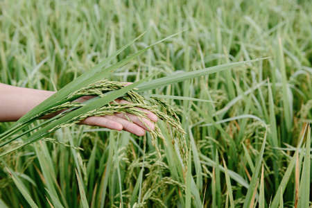 Woman hand touching ears of rice and Golden riceberry fields, rice field at Sansiri backyard in bangkok, thailand.