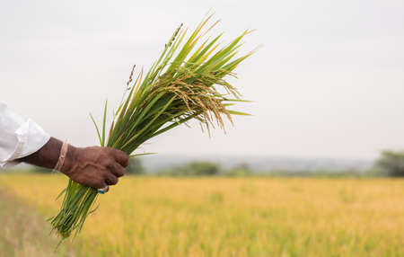 Close up of farmer Hands holding paddy crop with copy space - concept good crop yield and harvesting season