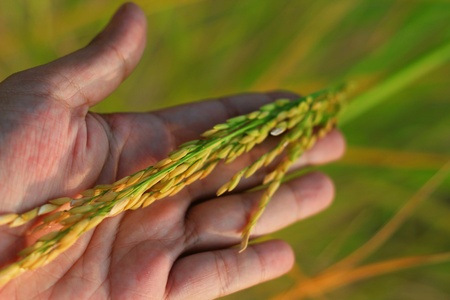 Ripe ears of rice in a man hand. Products from rice concept. Food for human from rice.