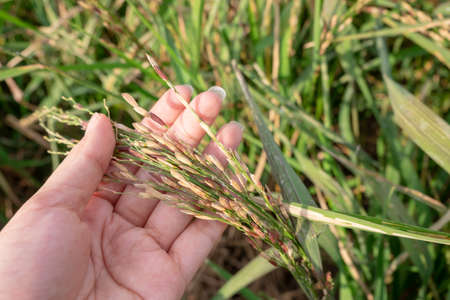 Rice Plantation Farming and Agriculture Concept, Close Up of Female Farmer With Holding Rice Inflorescence in Organic Farmland at Countryside of Thailand. Rural Rice Planting Lifestyles