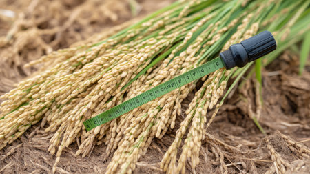 A close-up image of a rice plant with a measuring tape placed on the soil, illustrating growth stages and providing insights into agricultural practices and measurements.