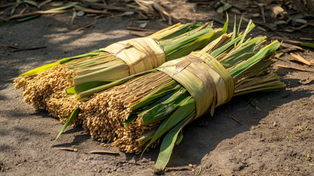 Close-up of freshly harvested paddy rice bundles lying on the ground, showcasing the golden grains and lush green leaves, symbolizing the bounty of a successful harvest.